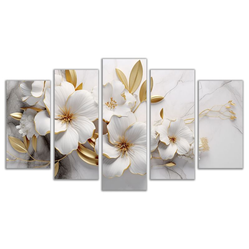 1059 Wall art decoration (set of 5 pieces) Flowers in gold and white