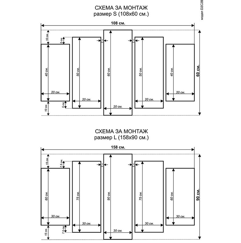 S size: Overall dimensions 108х60 cm (20х40 cm - 2 pcs., 20х50 cm - 2 pcs., 20х60 cm - 1 pc.)