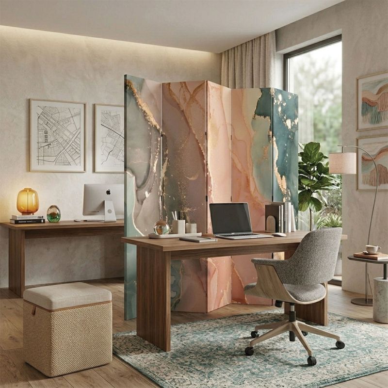 Сгъваем параван с изящен абстрактен дизайн в нежни розови и тюркоазени нюанси, който внася артистичност и модерно излъчване в интериора. Подходящ за хол, спалня, студио или офис, той съчетава практичност с елегантна декорация.