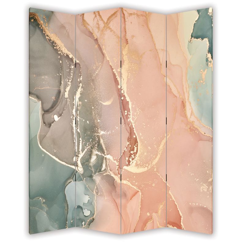 Стилен сгъваем параван, който е не само функционална преграда, но и впечатляващ акцент в интериора. Абстрактният дизайн в розово-златисти и зеленикави тонове създава усещане за лукс и артистичен уют. Изработен е с висококачествен печат върху канава, опъната върху дървени подрамки, а сгъваемата конструкция позволява лесно преместване и употреба. Предлага се с 3, 4, 5 или 6 крила, с възможност за едностранен или двустранен печат, за да се адаптира напълно към вашето пространство.