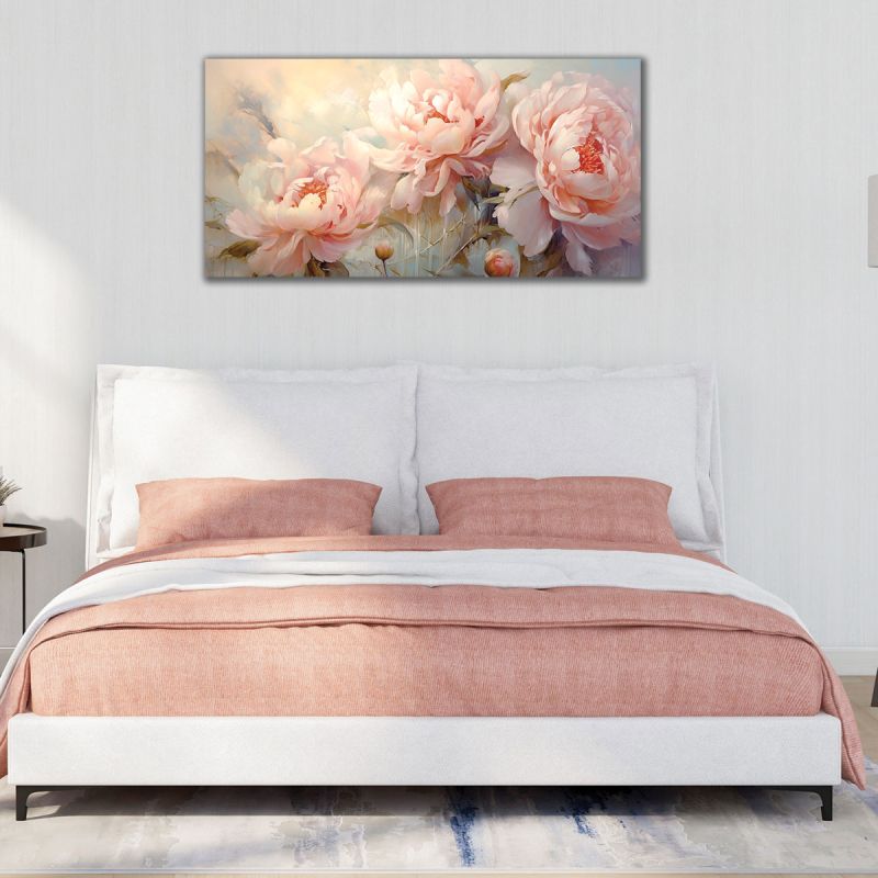 Нежна картина с розови божури в пастелни тонове, излъчваща мекота и романтична елегантност. Подходяща за декорация на хол, спалня или уютен кът за отдих.