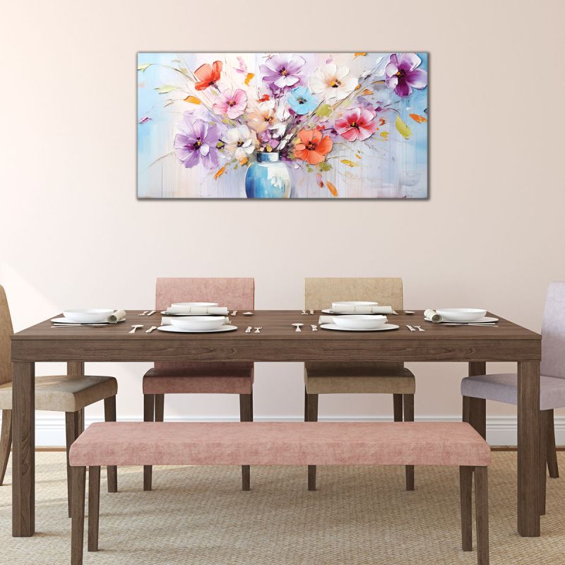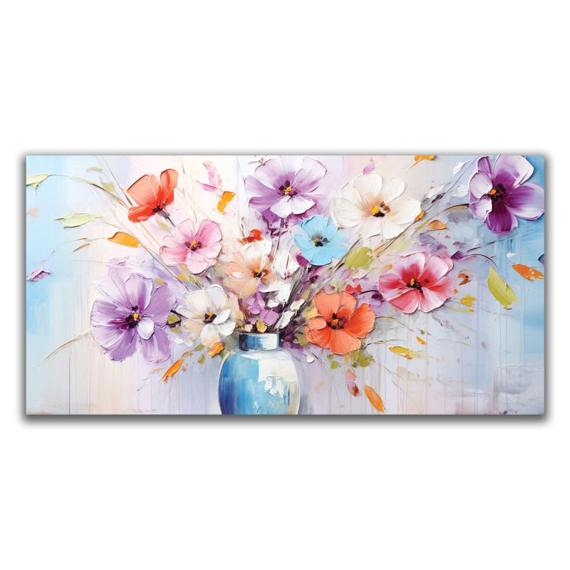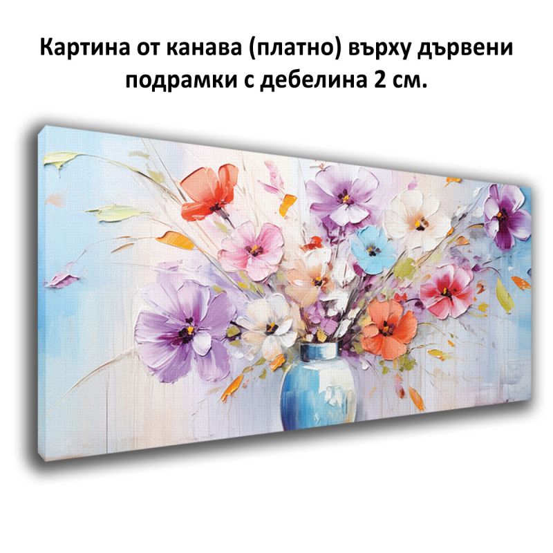 Цветна картина с букет цветя в синя ваза, носеща настроение и усещане за свежест. Идеална за хол, кухня, трапезария или всяко пространство, което се нуждае от повече цвят и позитивна енергия.