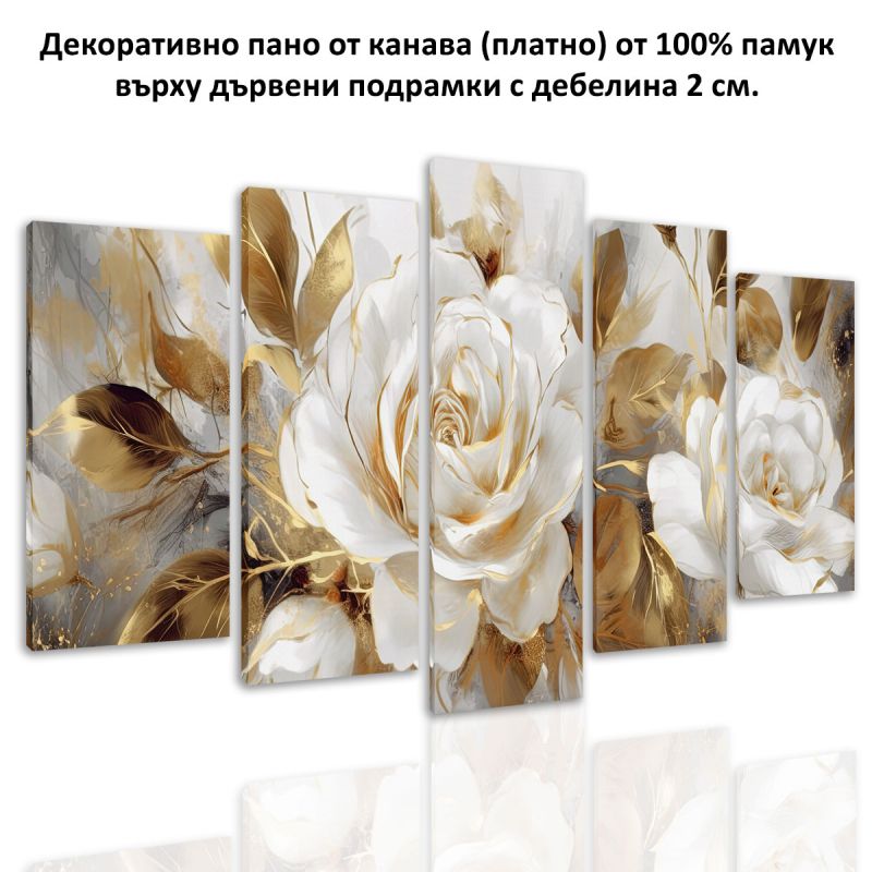 1102 Картина пано от 5 части Бяла роза в златно сияние
