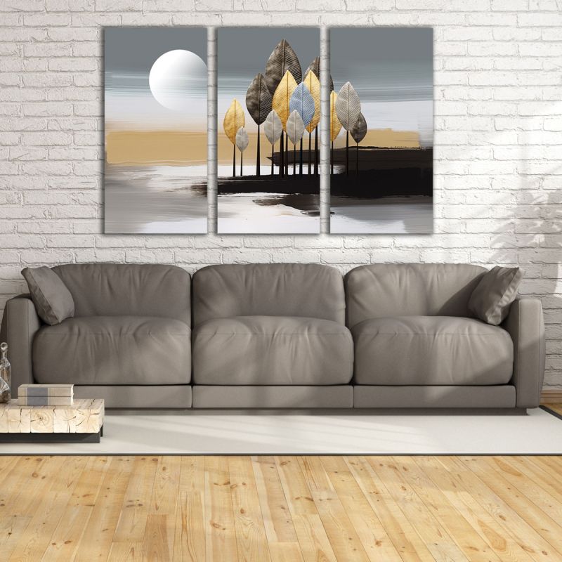 Паното впечатлява с модерна визия, изчистени линии и абстрактно изобразени дървета, изпълнени в луксозни металически тонове. Висококачественият принт гарантира ярки цветове, устойчивост и отлично визуално въздействие във всяко помещение. Предлага се в два варианта – върху здрави PVC плоскости или върху канава, опъната на дървена рамка за по-класически вид. Паното е идеален избор за съвременни интериори, минималистични пространства или дизайнерски офиси, където добавя характер и баланс.