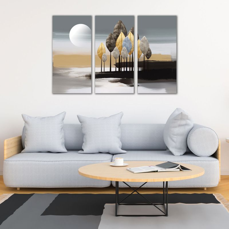 Модерното пано от 3 части с абстрактен пейзаж в нюанси на златно, сиво и черно, който създава усещане за дълбочина и елегантен контраст. Дизайнът е подходящ за хол, офис, спалня или входно помещение, където се търси стилен и съвременен акцент.