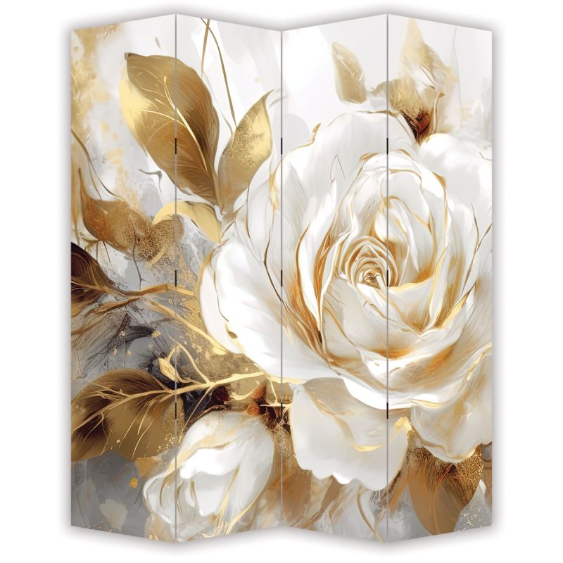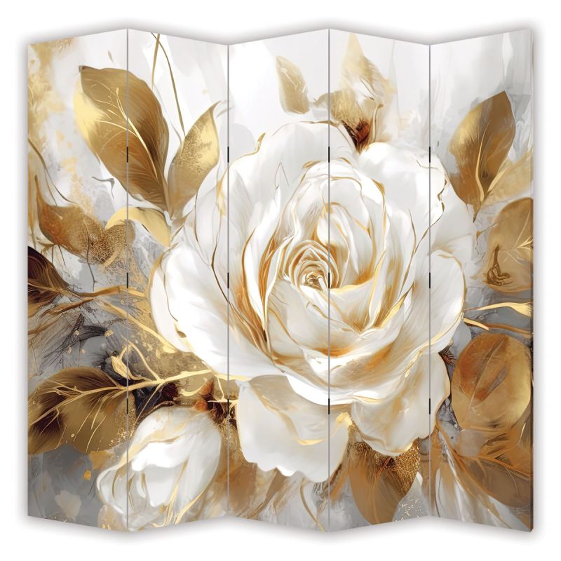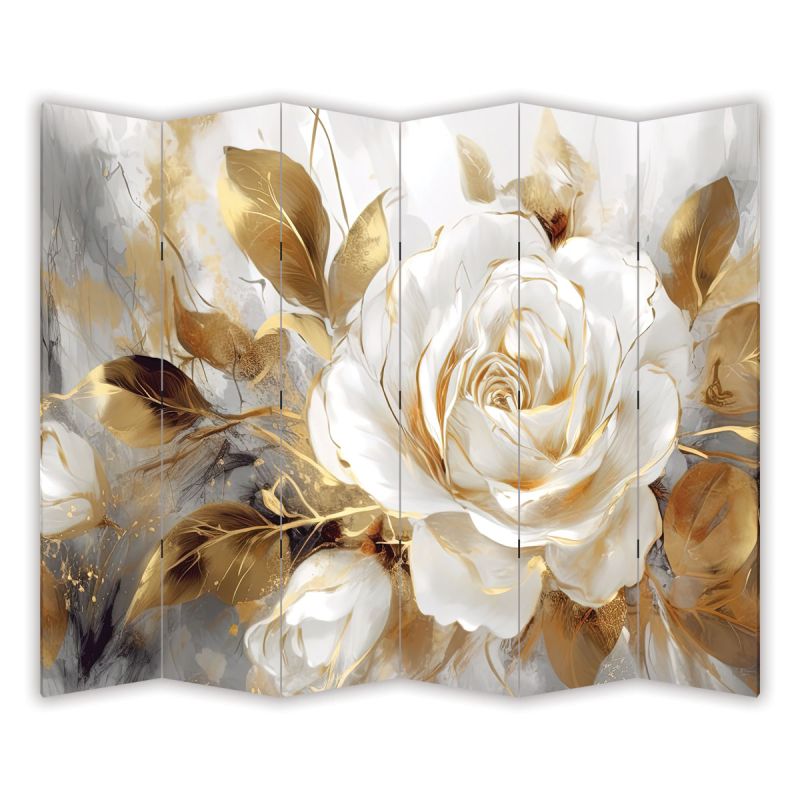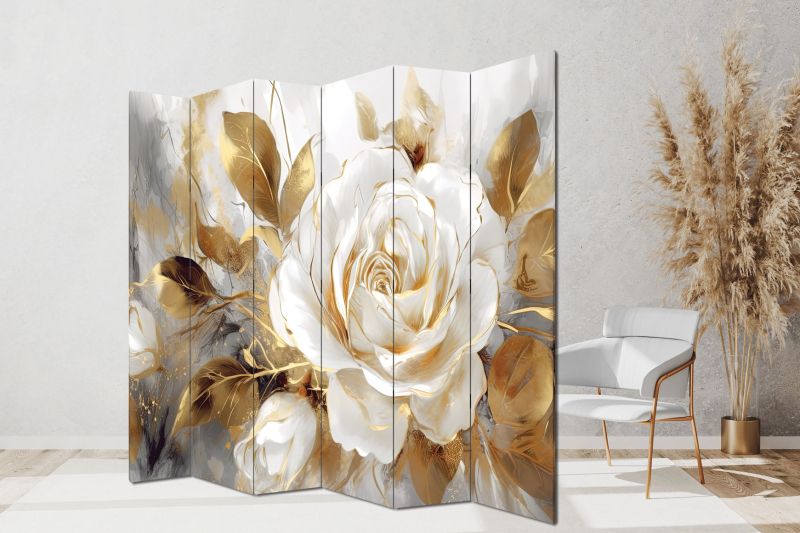 P1102 Декоративен параван Бяла роза в златно сияние (3, 4, 5 или 6 части)