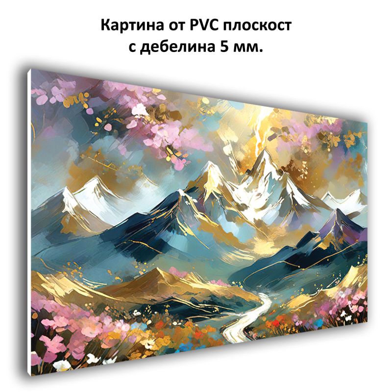 Картина за стена с величествен планински пейзаж, озарен от златна светлина и нежни цветни акценти, които създават усещане за простор и вътрешен покой. Подходяща е за модерни, скандинавски и артистични интериори – дневна, спалня, кабинет или хотелски пространства. Декор, който носи вдъхновение и хармония.