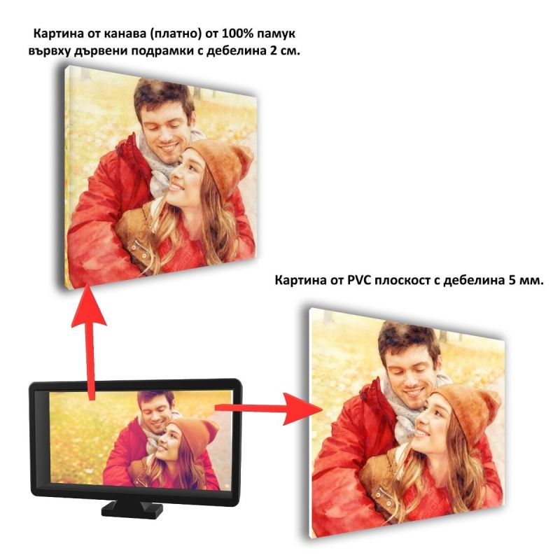 Вариант 2 Високотехнологичен пълноцветен печат върху канава от 100% памук, прецизно опъната върху дървена подрамка с дебелина 20 мм.