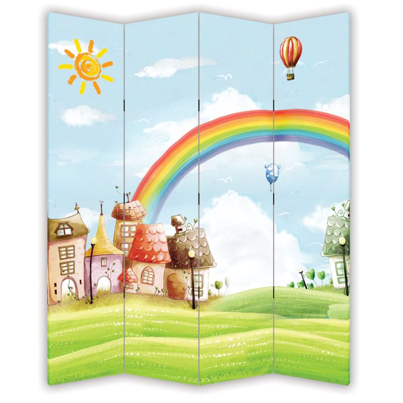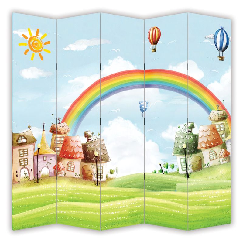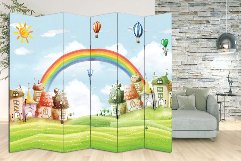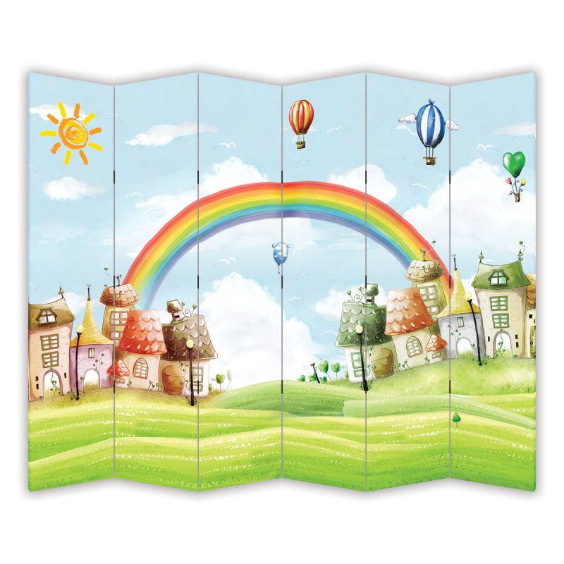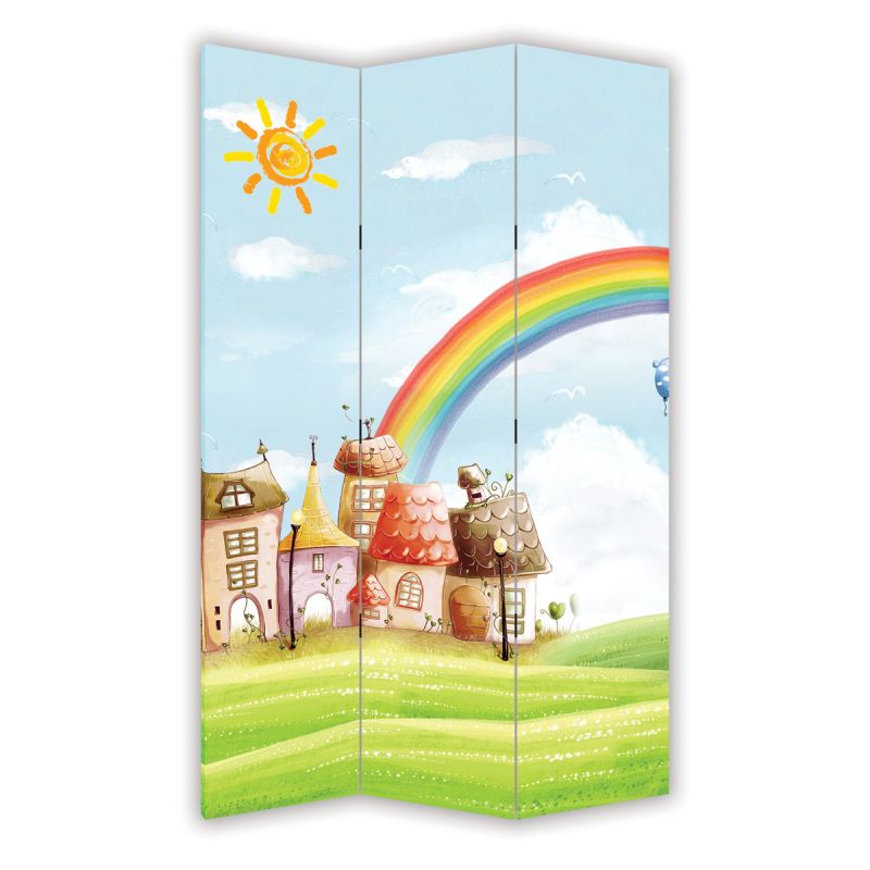 Детски декоративен параван с цветна илюстрация на приказни къщички, дъга и балони, създаващ весела и уютна атмосфера. Идеален за детска стая, кът за игра или занималня, където носи настроение, цвят и усещане за фантазия. Освен декоративна функция, служи и като практична преграда за обособяване на пространство.