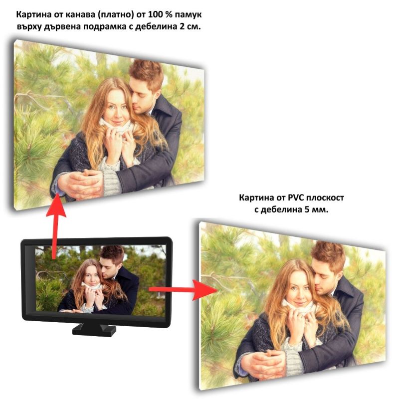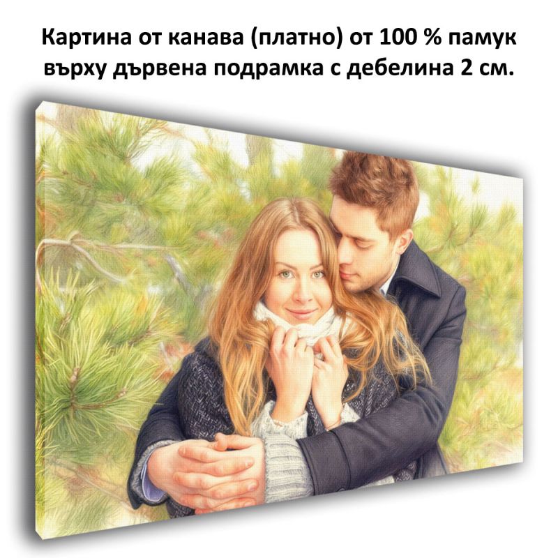 Картина от снимка с мек пастелен ефект. Превърнете любим спомен в изискан портрет с ефект пастел – подарък, който остава завинаги.Дигиталната обработка създава артистично и меко излъчване, подходящо за стилна декорация на дома. Нежните линии и меките тонове придават артистична дълбочина на най-ценните ви моменти. Изработва се като висококачествен принт върху PVC или канава. Луксозен акцент за дома или трогателна изненада за специален човек.