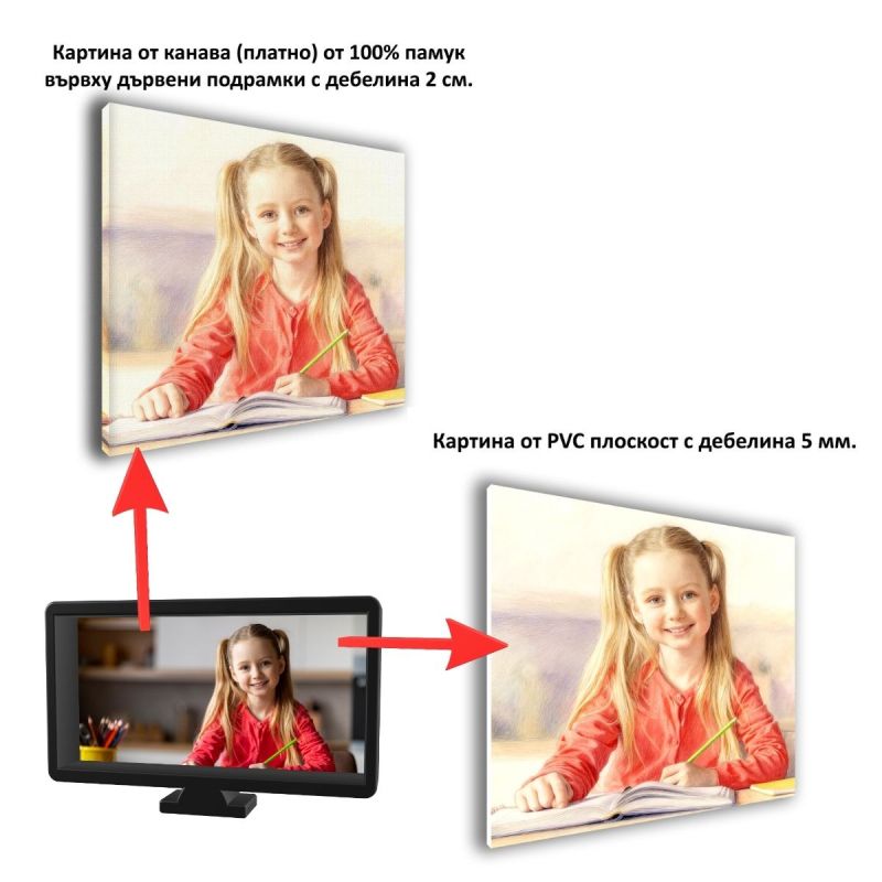 Вариант 2 Високотехнологичен пълноцветен печат върху канава от 100% памук, прецизно опъната върху дървена подрамка с дебелина 20 мм.