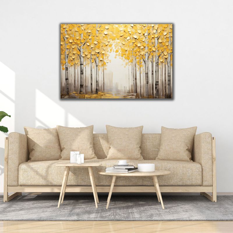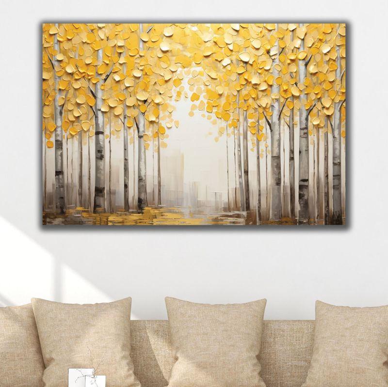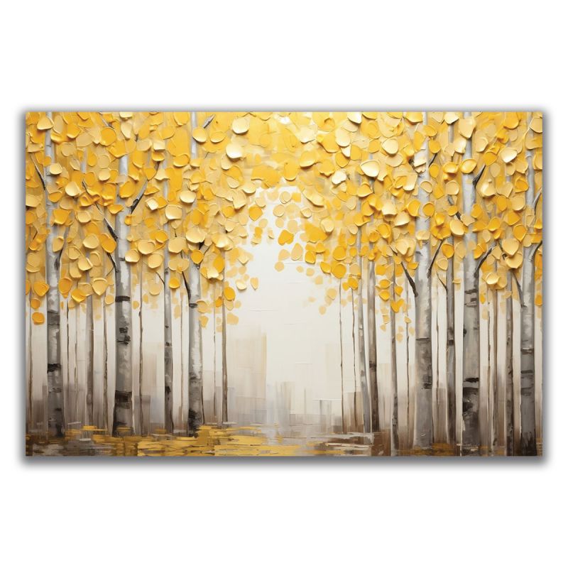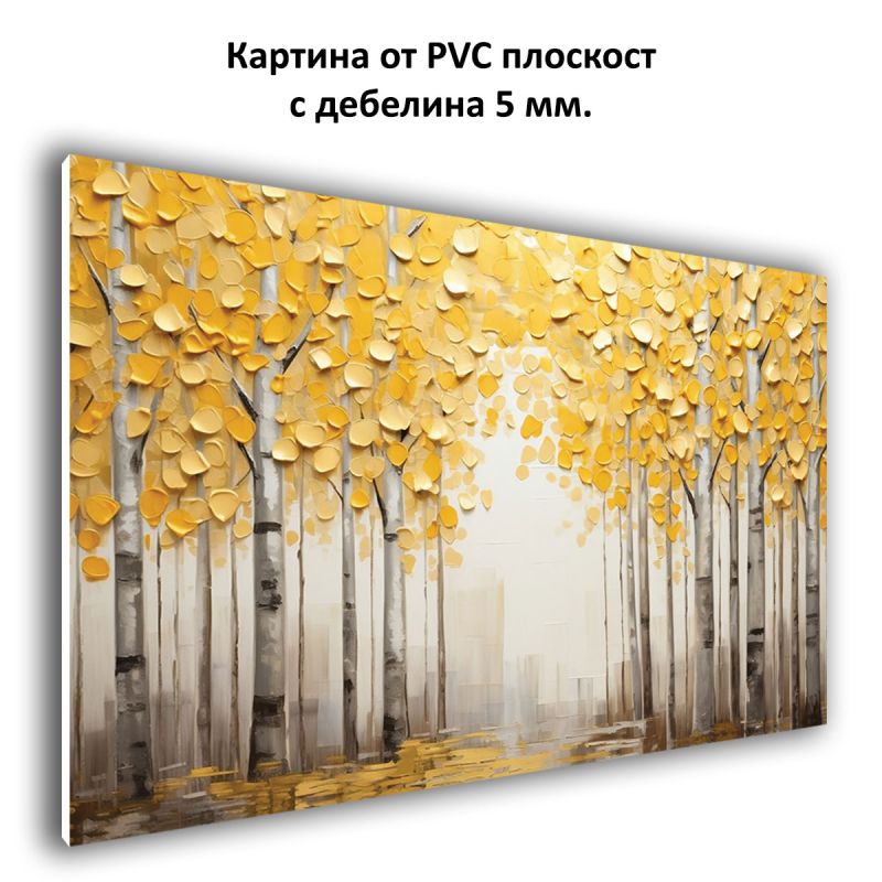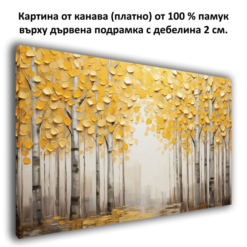 Стилна картина за стена с мотив на брезова гора в златисти нюанси, която съчетава модерна естетика и природна красота. Художественият принт създава усещане за дълбочина, светлина и уют, превръщайки се в изискан акцент за всяко помещение. Картината се изработва като висококачествен печат и се предлага в два варианта – върху PVC плоскост или върху канава, опъната върху дървена подрамка. Подходяща е за хол, спалня, офис или хотелски интериор.