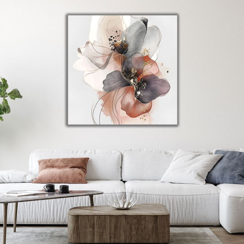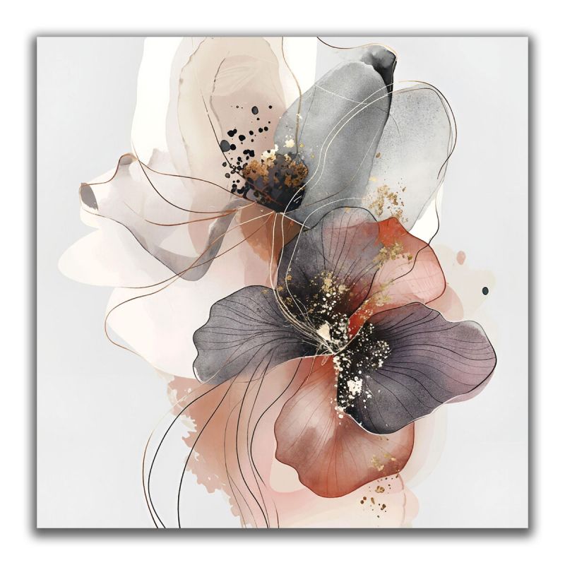 Елегантна абстрактна картина с флорални мотиви в нежни бежови, сиви и теракотени нюанси, допълнени със златисти акценти. Съчетава модерна визия и артистична лекота, което я прави подходяща за хол, спалня или стилен офис. Перфектен избор за интериори в минималистичен, скандинавски или съвременен стил.