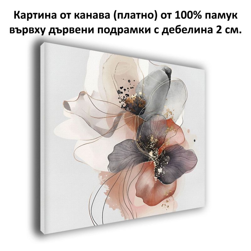 Модерна картина за стена с изящна абстрактна композиция с флорални елементи, съчетаваща меки цветови преходи и деликатни златисти детайли. Дизайнът внася усещане за спокойствие, елегантност и баланс във всяко пространство. Подходяща е както за дневна и спалня, така и за офис или хотелски интериор. Предлага се като висококачествен принт върху PVC плоскост или канава с дървена подрамка, което гарантира издръжливост и стилна визия без нужда от рамка. Идеален акцент за модерни и изчистени пространства.