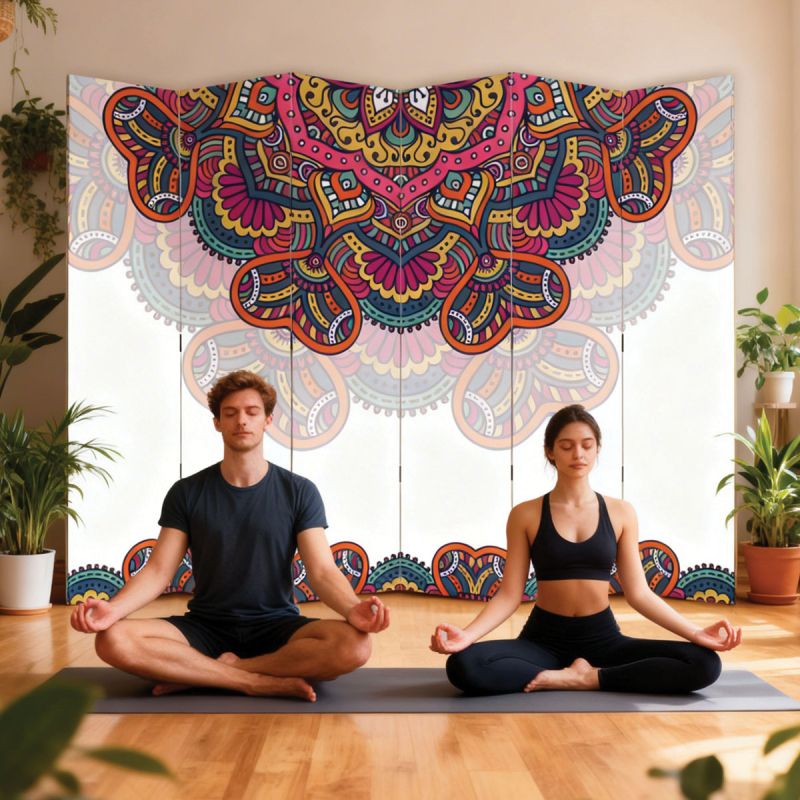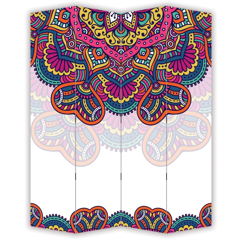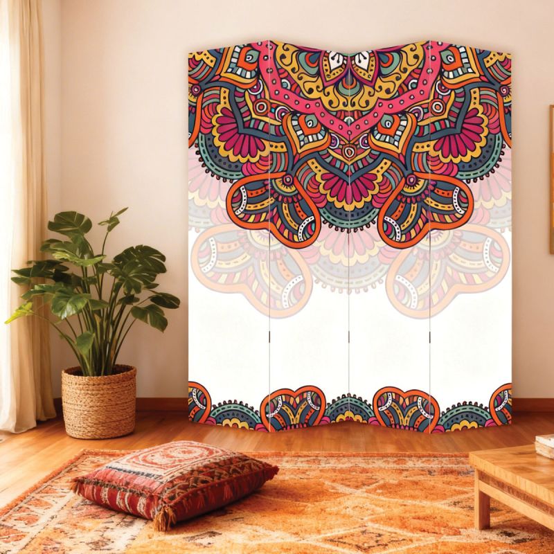 Сгъваем параван, изработен с висококачествен печат върху канава, опъната върху здрави дървени подрамки. Цветният мандала дизайн с наситени тонове го превръща в силен визуален акцент и център на вниманието в интериора. Предлага се във варианти с 3, 4, 5 или 6 крила, както и с едностранен или двустранен печат. Лек и практичен, той е лесен за преместване и съхранение. Подходящ е както за дом, така и за креативни пространства и бизнес среди.