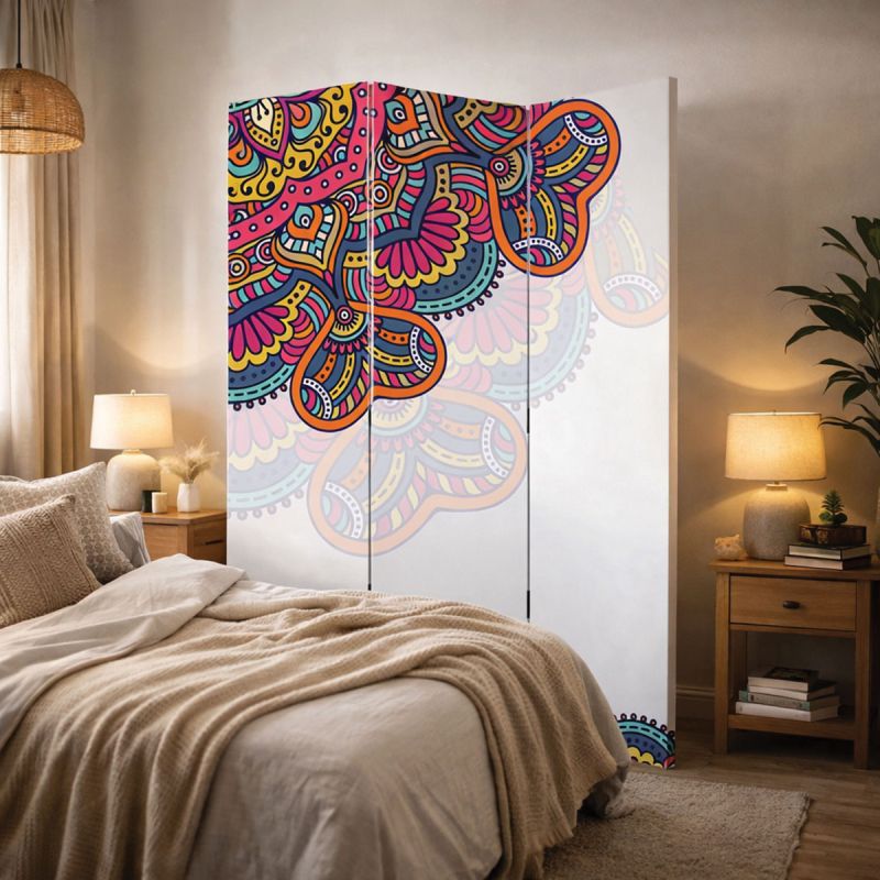 Ярък и артистичен параван с многоцветен мандала дизайн, който внася енергия и индивидуалност във всяко пространство. Подходящ за модерни, бохо и креативни интериори – дневни, студиа, офиси или арт пространства. Създава жива, вдъхновяваща и позитивна атмосфера.
