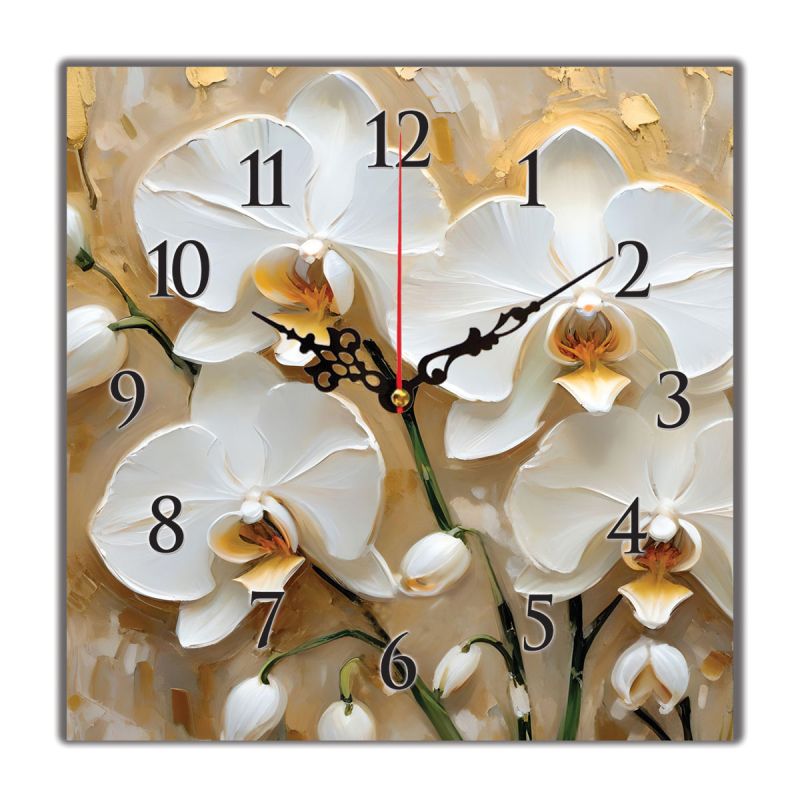C1085_1 Стенен часовник с принт Бели орхидеи върху топъл златист фон